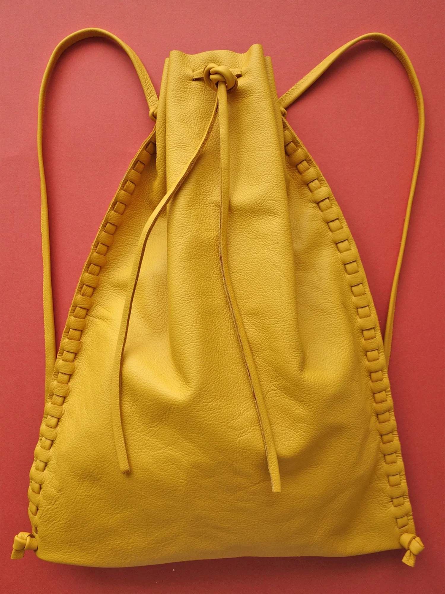 The leather drawstring bag is handmade without any stitch. The connection is the construction of the bag.